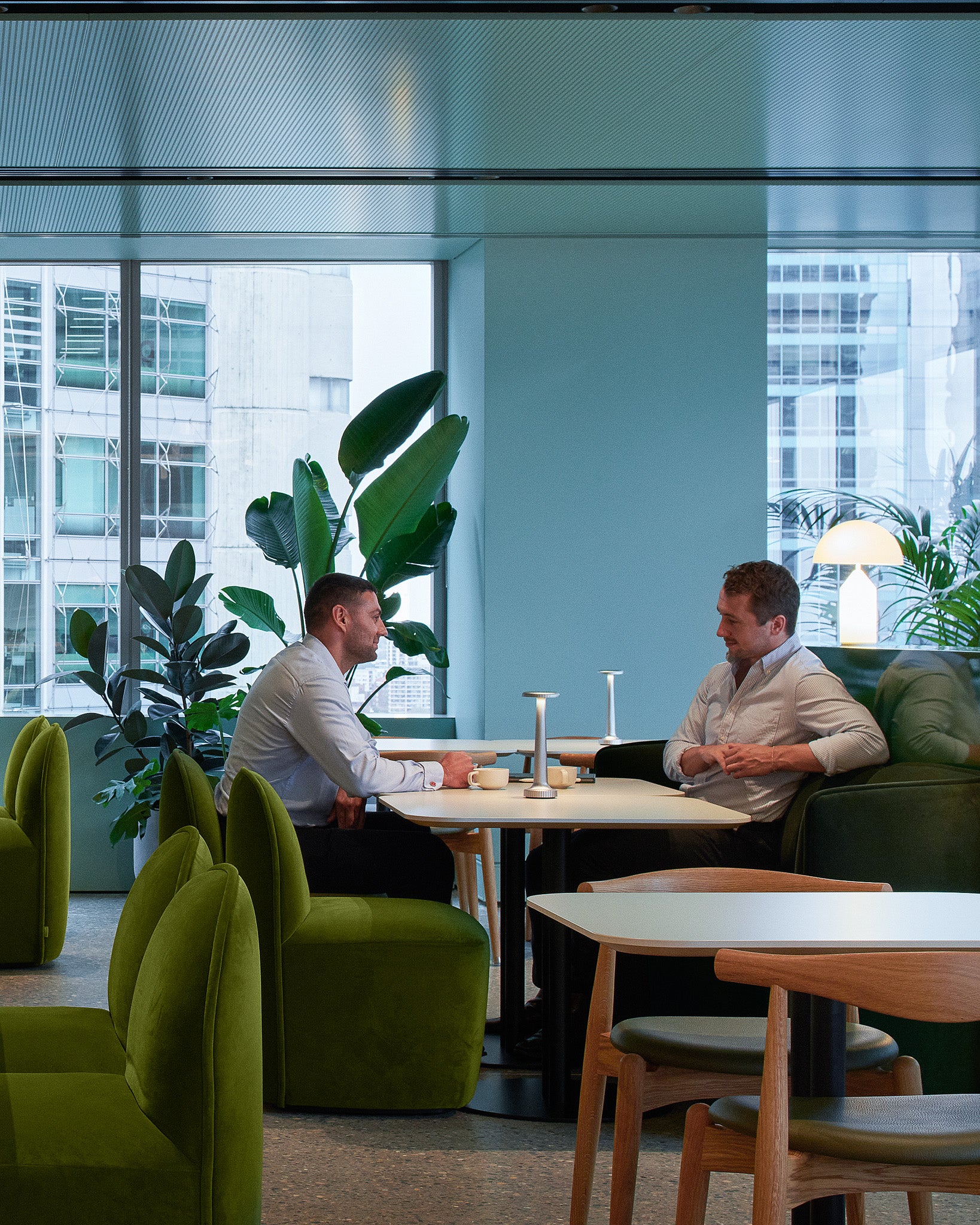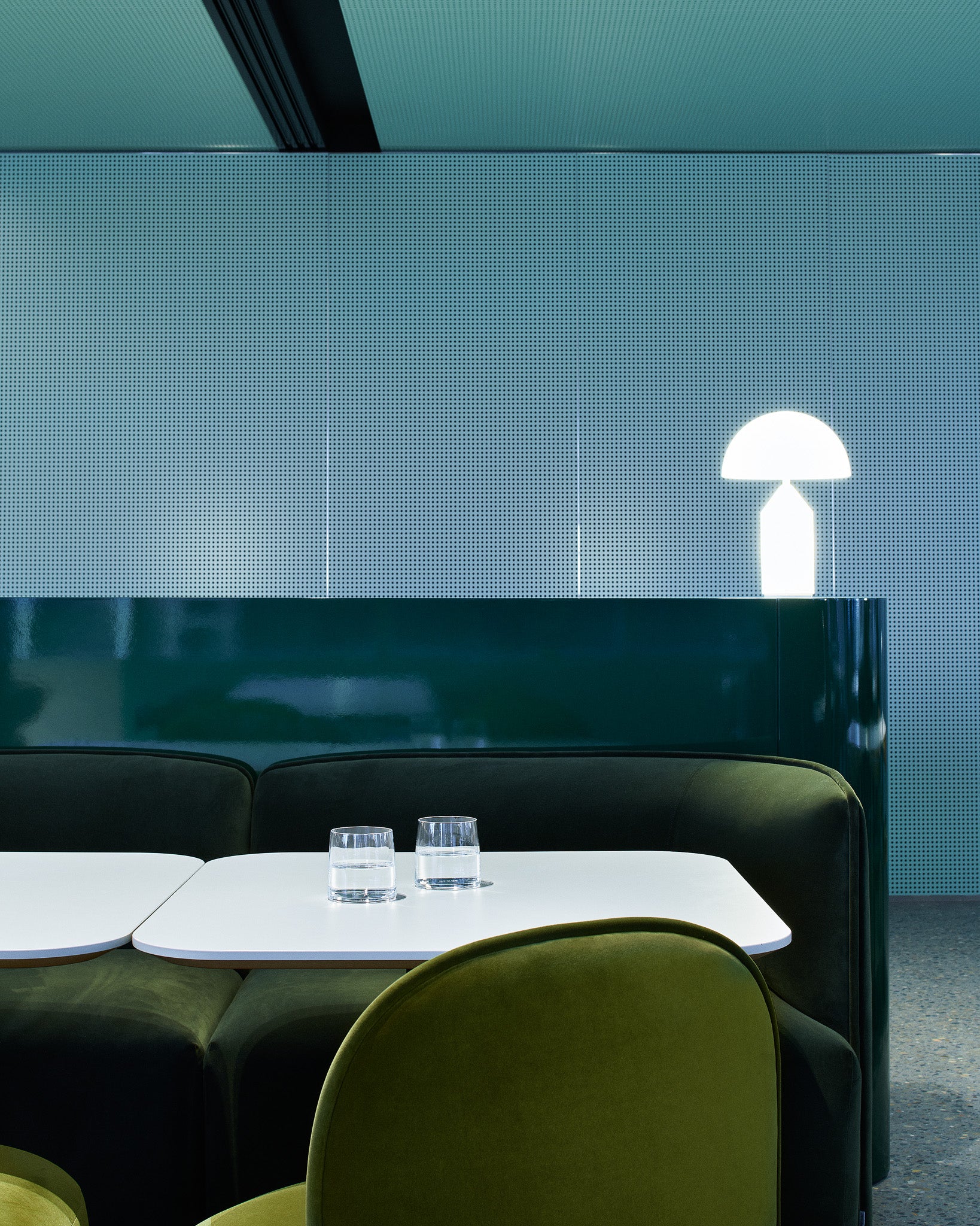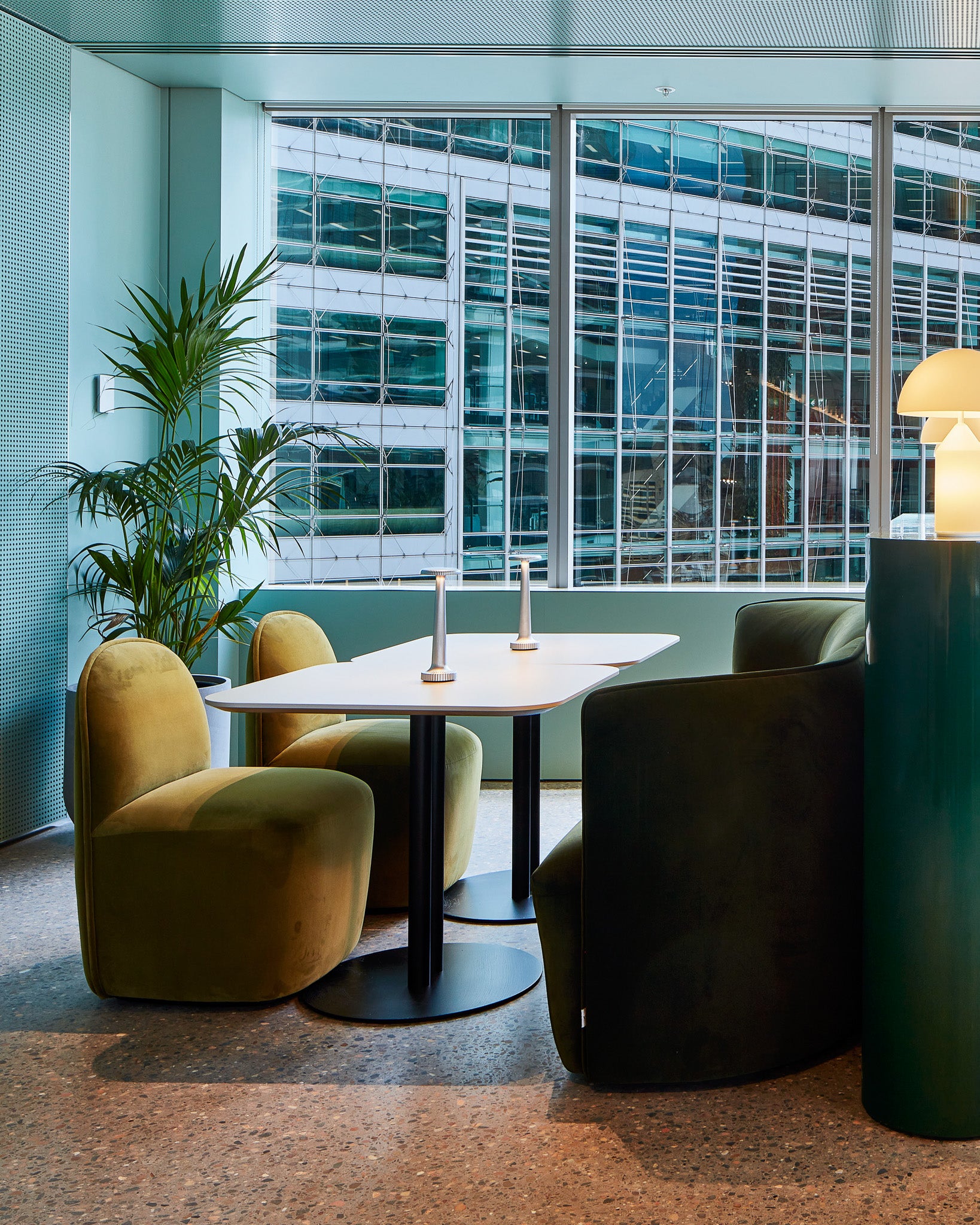 The Rest Bench by Sebastian Herkner introduces a refined interpretation of the classic bench typology. Formed by two upholstered elements joined in a quiet asymmetry, it brings a subtle richness in shape and detailing. Positioned within circulation and waiting areas, it offers a calm and versatile place to pause. Together, these pieces contribute to a workplace that balances colour, form, and functionality in a clear and cohesive way.