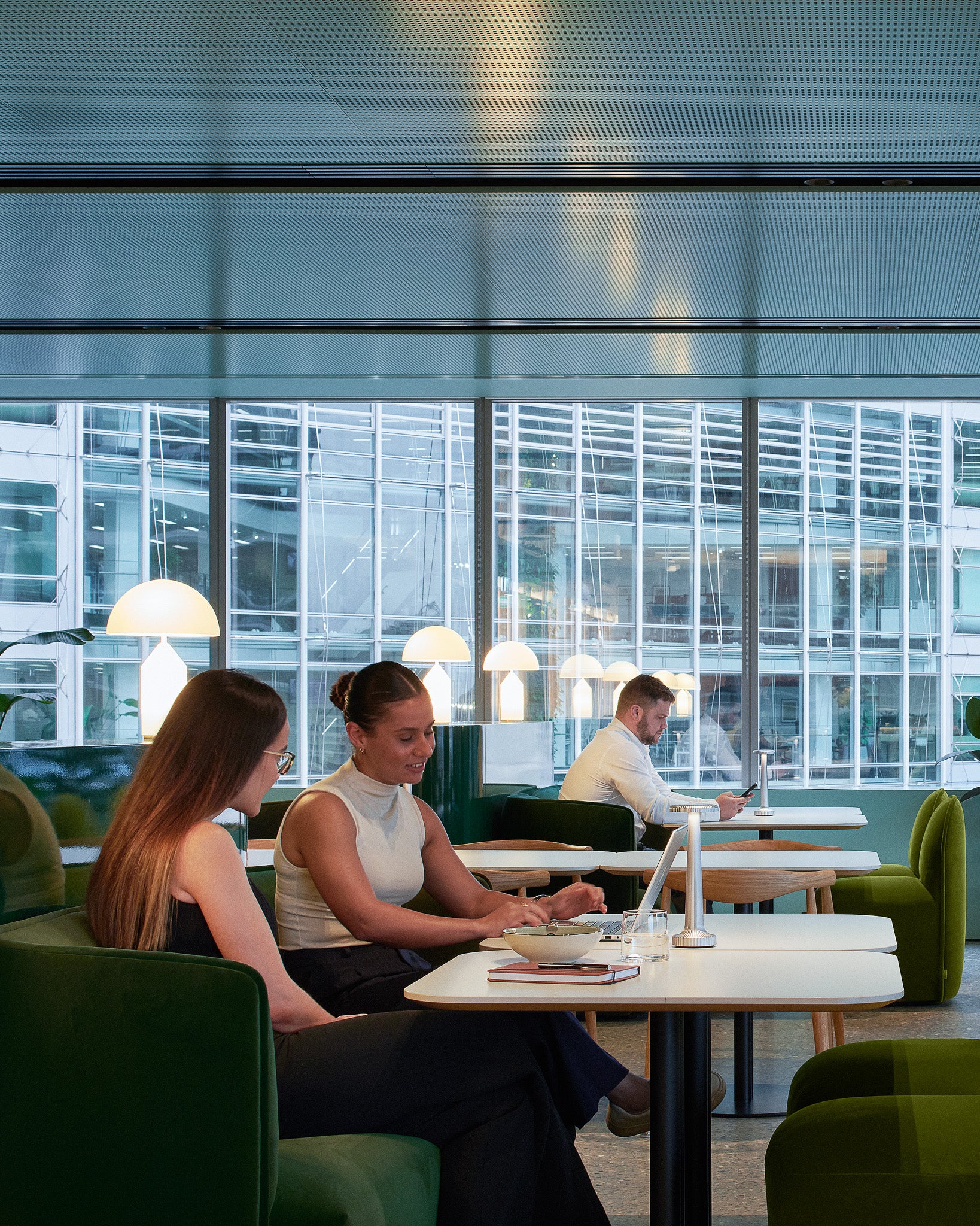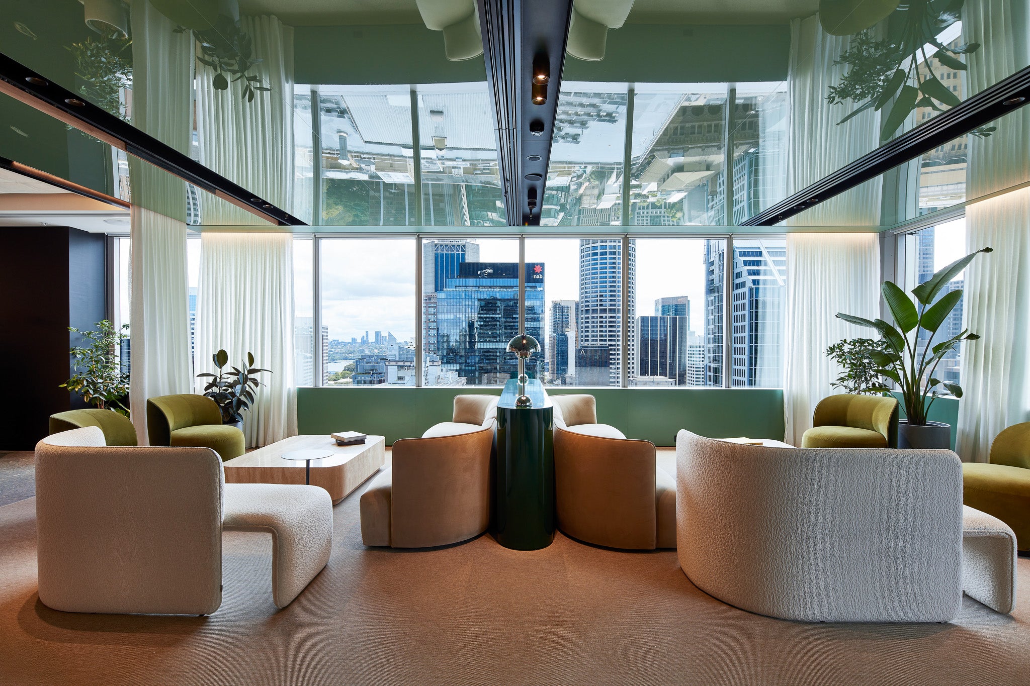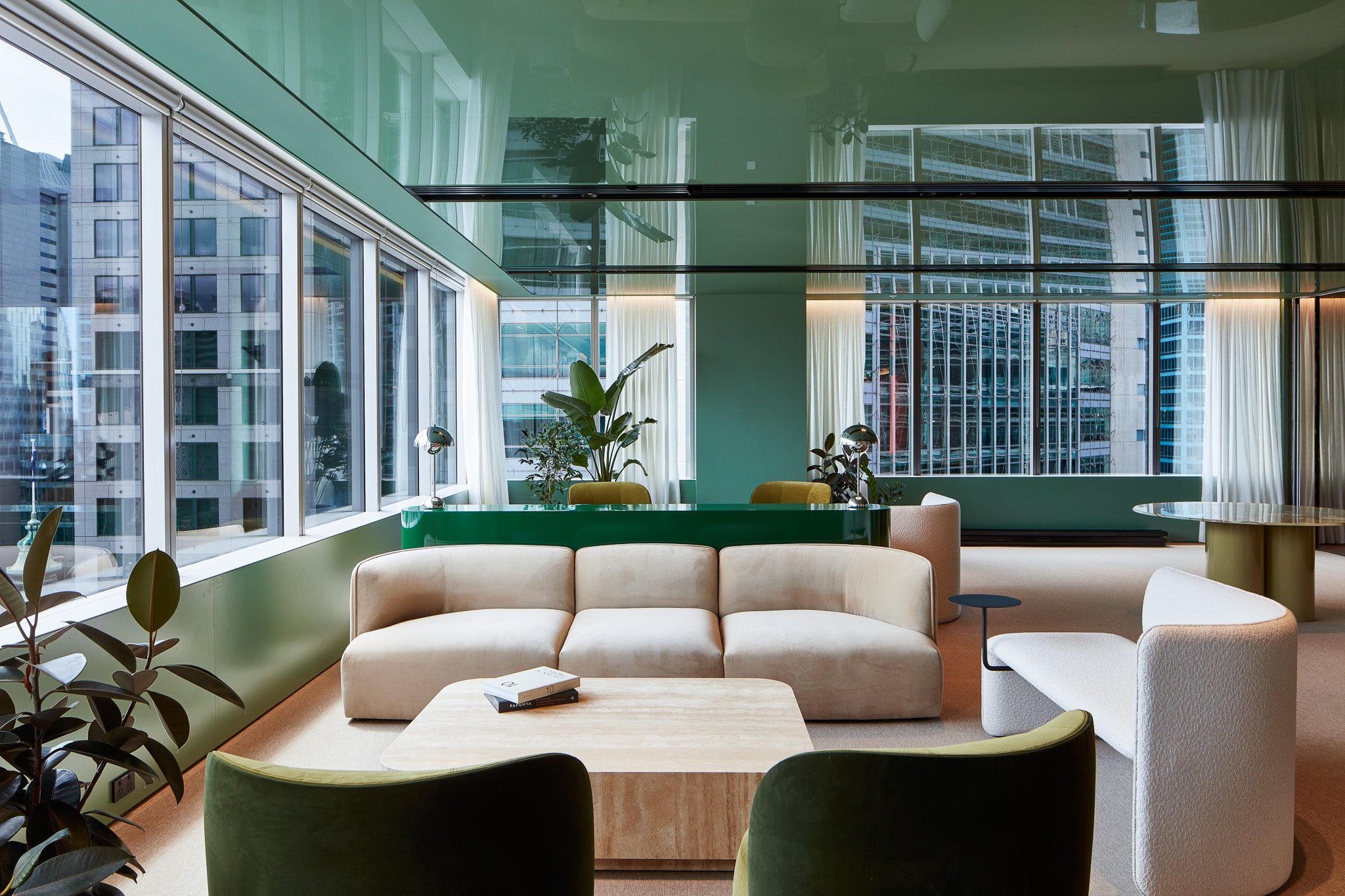 At the CBRE offices in Sydney, Bates Smart has created a workspace shaped by a clear material palette and a distinctive green theme. High-gloss ceilings and matching upholstery establish a consistent visual expression across the interior.