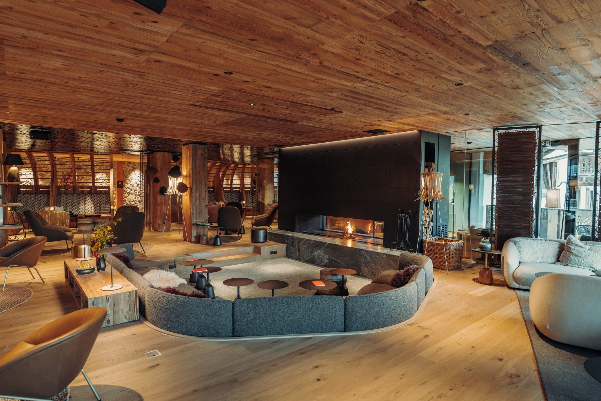 At the heart of the lounge, a customised Panorama Lounge Sofa embraces the central fireplace, creating a sculptural focal point that invites guests to gather and unwind. Across the open spaces, Montholon Sofas and Lounge Chairs complement the tactile warmth of the interior, paired with Coin Side Tables and Mango Chairs to form intimate seating clusters.