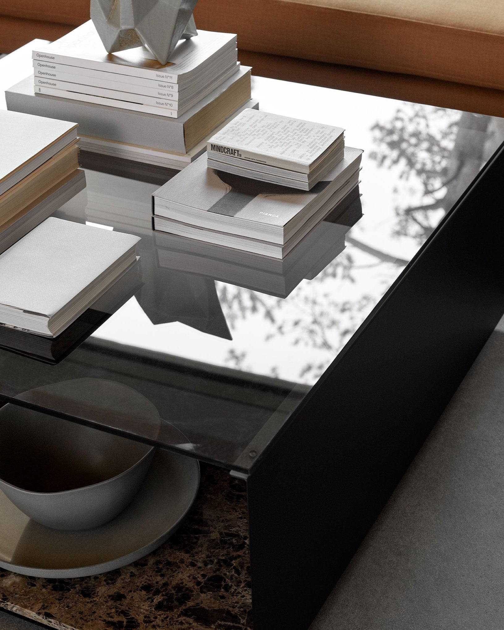 Framed to simultaneously store and display, the series of Expose tables renders a fresh take on functionality. On top of the black powder-coated steel structure, a pane of tinted glass adds a semi-transparent expression, while at the bottom, a slab of Brown Emperador marble provides a visual counterbalance.