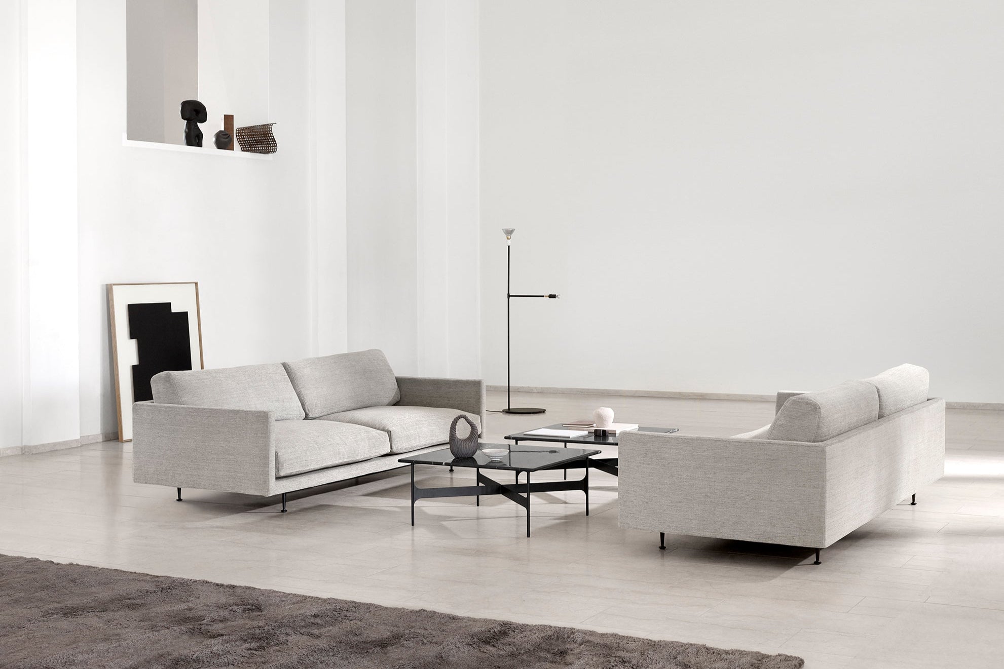Drawn with dimensions that exude comfort, depth and modern elegance, the Maho Sofa is a study in lounging - a true retreat for days of slowing down, enhanced through loose cushions with down fill. Crafted as a voluminous low-lying lounge design, the Maho Sofa rests atop a slim and sharply defined frame in black powder-coated steel.