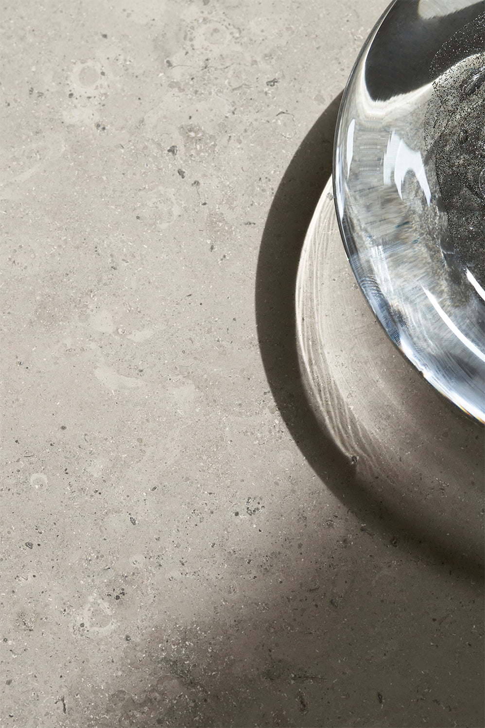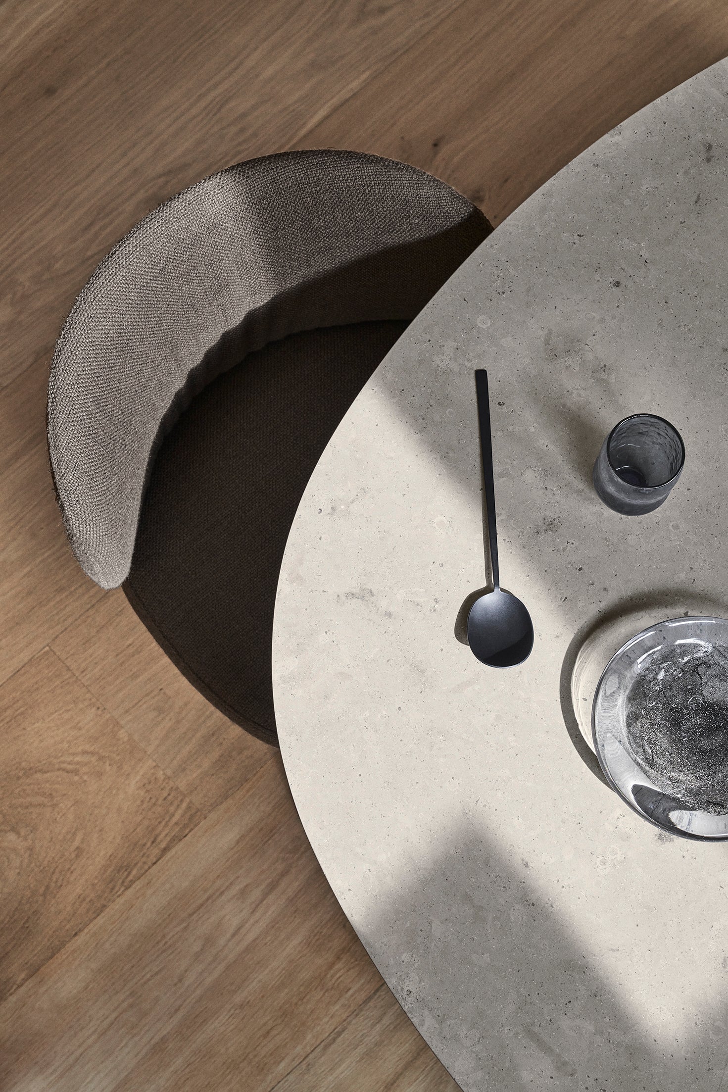The Ovata Table features a simple tabletop cast in matt-polished Grey Jura limestone with subtle fossil markings, reflecting the unique terroir of its origin. The distinctive yet comforting rounded square shape of the tabletop is echoed in the sturdy column base, fostering pleasant transitions between the contrasting yet complimenting tactile surfaces.