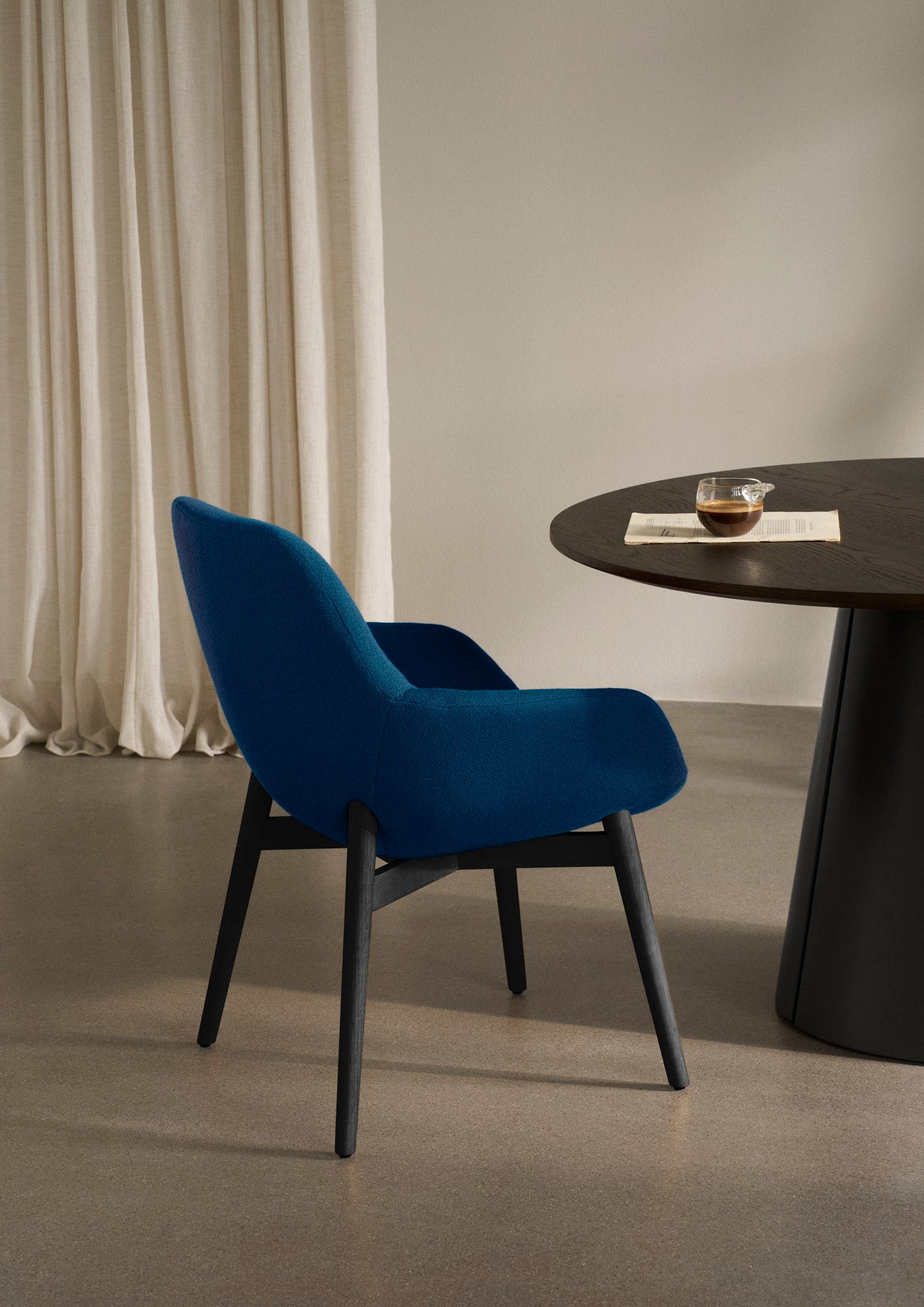 Balancing softness with refined aesthetics, the Sinum Chair is available with three distinct base options: a classic four-leg tubular base in black powder-coated steel, a delicate, tip-toeing swivel base with an optional return function - also offered with castors for mobility - and a crafted wooden base in light, dark brown, or black oak that lends the chair a natural warmth.