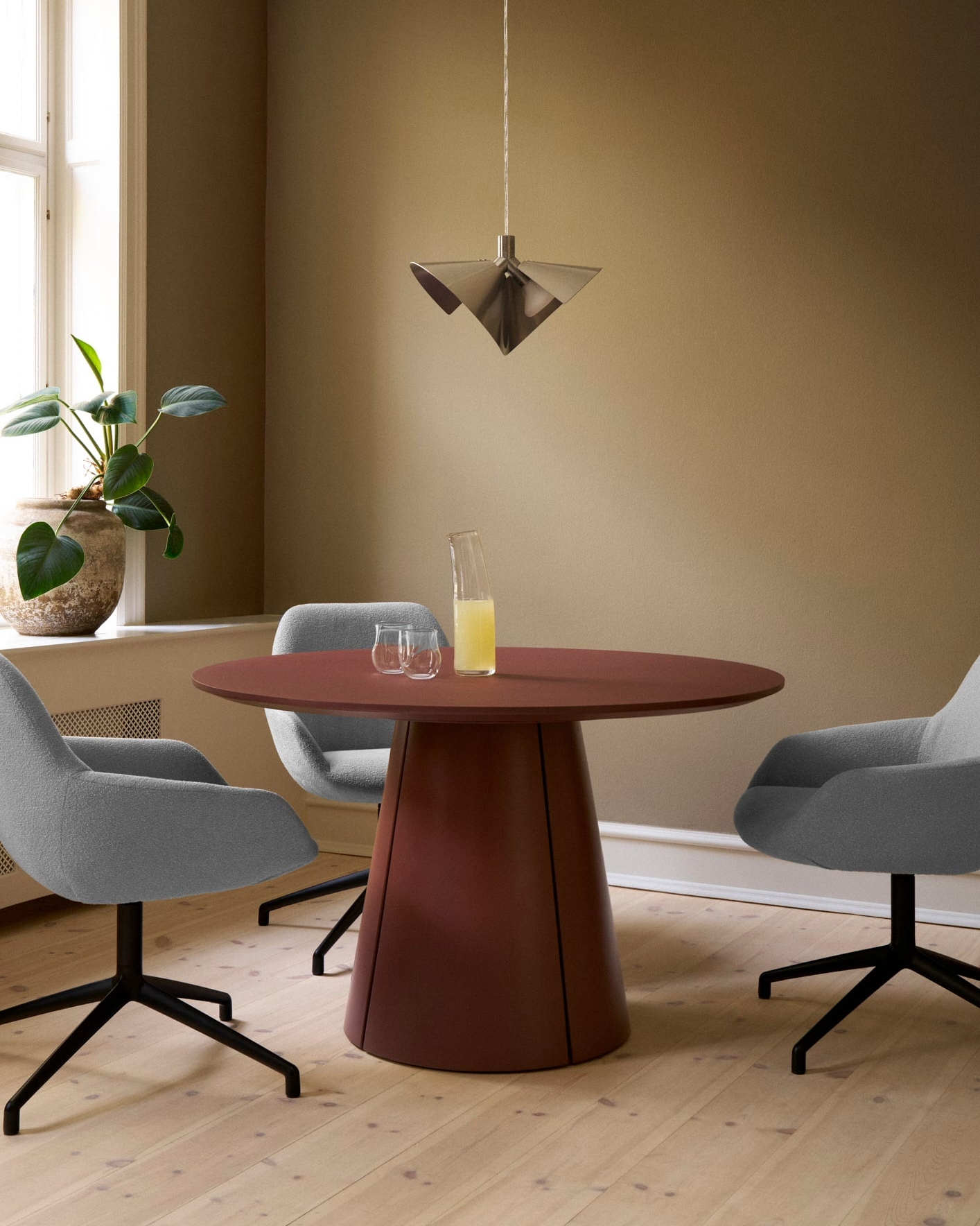 Designed by Danish studio 365° North, the Trim Table series is defined by its conical column base, constructed from four rounded steel plates that assemble with ease. The vertical gaps between the plates create a distinctive architectural rhythm, giving the base both character and lightness while ensuring stability through its weighted core.