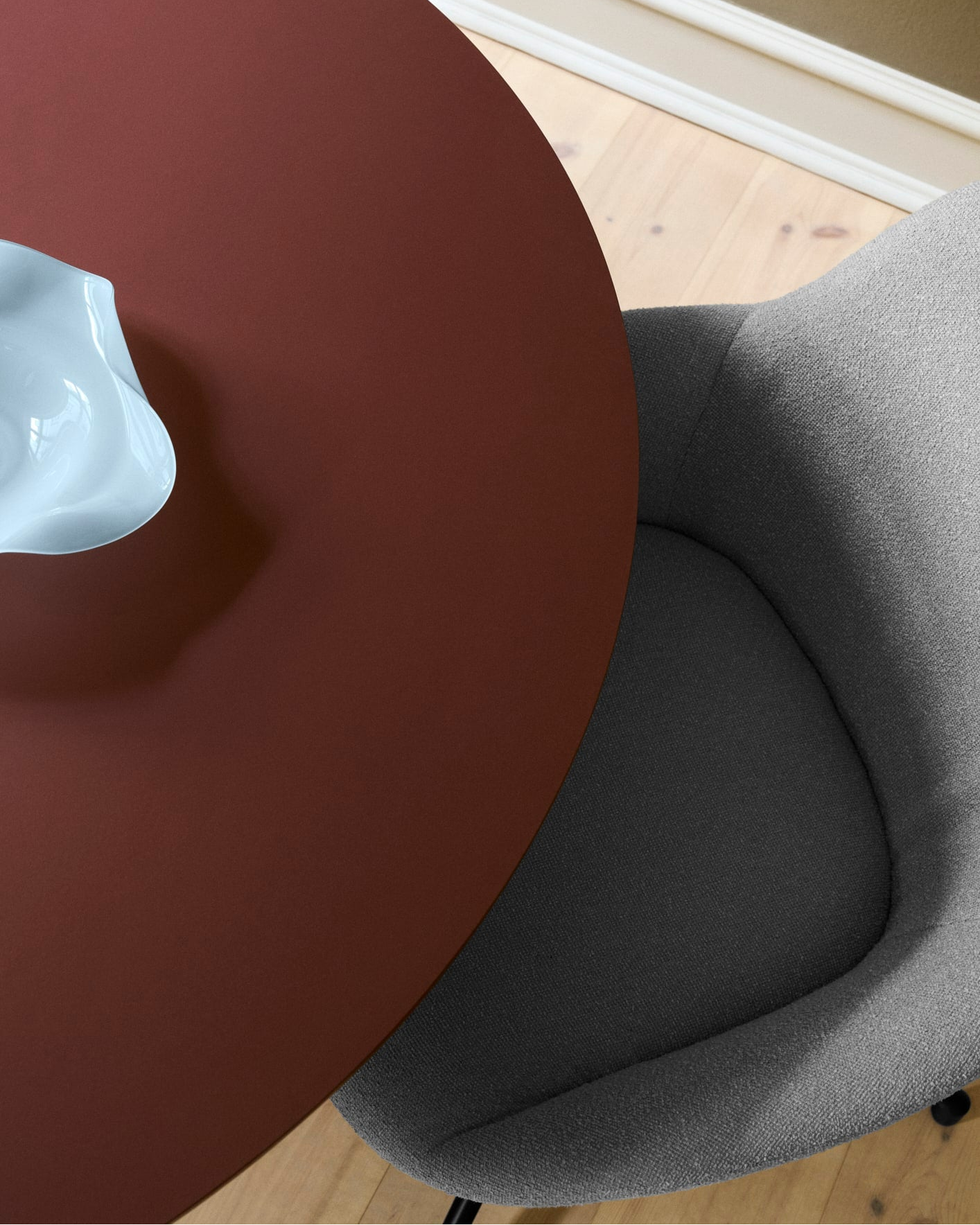 Balancing function and form, the Trim Table creates harmony between geometry and material. Tabletops in dark brown or black oak veneer, or black laminate, are paired with black powder-coated steel bases, while the burgundy linoleum version features a matching base - offering a selection of refined combinations that adapt seamlessly to diverse interior contexts.
